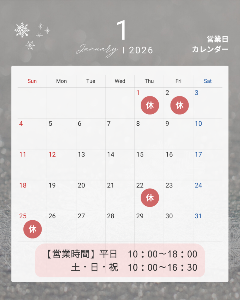 ◯一日休み⋯1/1(木)、1/2(金)、1/22(木)、1/25(日)
